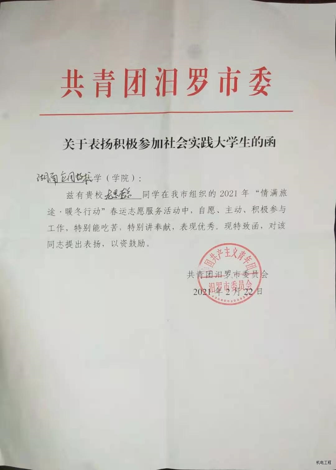 我校太阳成集团tyc7111机械设计制造及自动化专业19104班刘翔同学在寒假期间参加了“岣嵝乡返乡大学生志愿服务队”,并且表现优异受到了当地乡政府的表扬。机械制造及自动化专业19104班龙思懿同学参加汨罗市“情怀旅途,暖冬行动”春运志愿者活动,受到共青团泪罗市委员会的表扬。