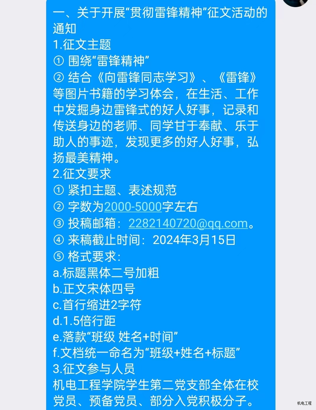 为弘扬雷锋精神,传承中华民族传统美德,引导广大同学树立正确的价值观和人生观。2024年3月4日—3月15日,我们学生第二党支部成功举办了“贯彻雷锋精神”征文活动。