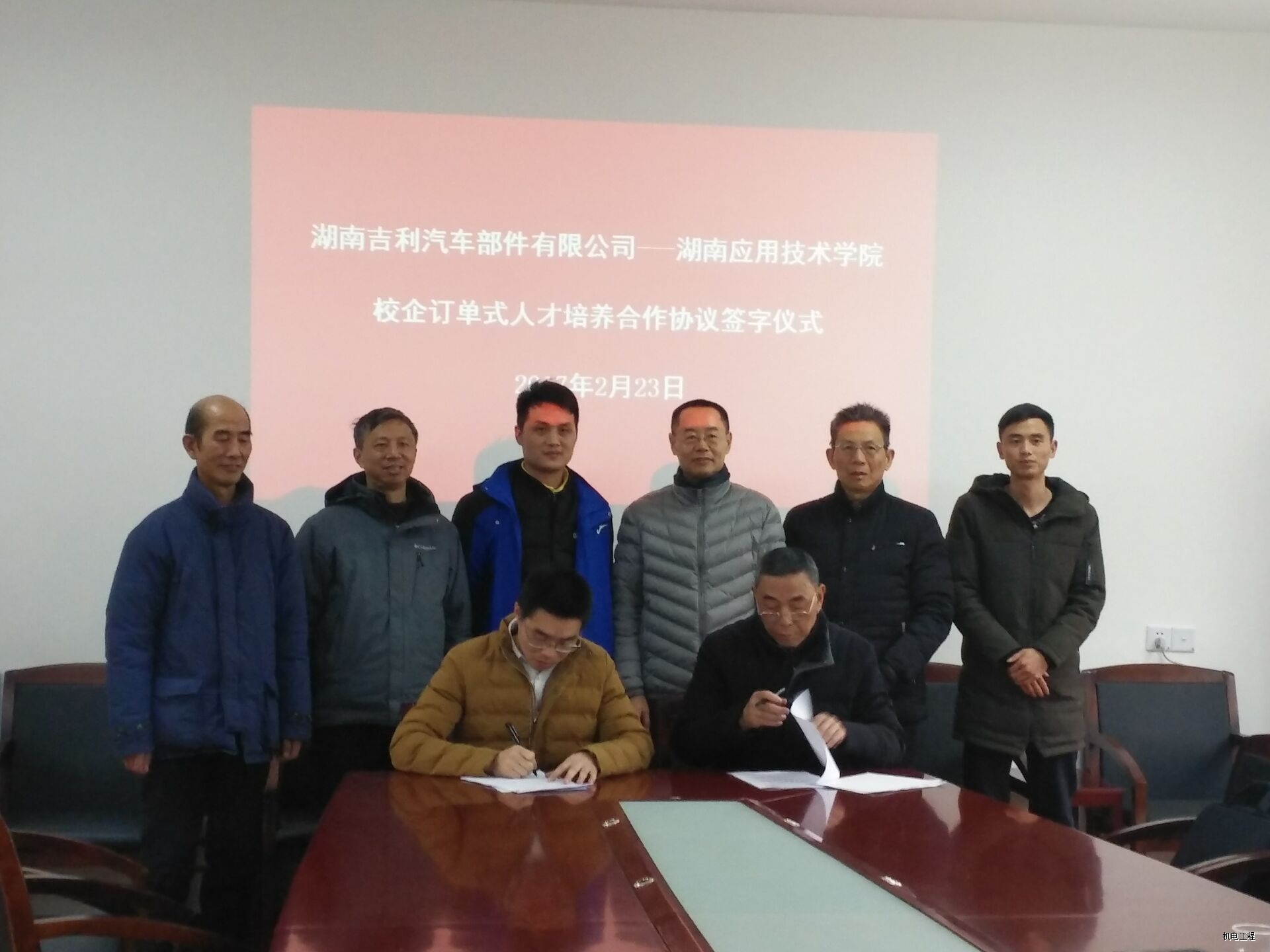 为贯彻实施李克强总理人大政府工作报告提出的人才培养“大国工匠”精神,及今年国家、省教育改革方案,我校太阳成集团tyc7111先行一步,与湖南吉利汽车部件有限公司签订了“校企”订单式人才培养合作协议。今年将首选100名“吉利班”学员,根据企业需求,共同制订培养方案。利用各自优势平台,采用“工学”交培模式,互派指导教师,共同培养学生,学生毕业派到吉利汽车公司就业。校长陆晨教授,太阳成集团tyc7111院长李新华教授、副院长刘吉普教授,湖南吉利汽车部件有限公司人事部招聘经理刘蹇,培训部主管杨喜等多人参与了签字仪式。双方就具体合作事宜进行了全面深入的洽谈。