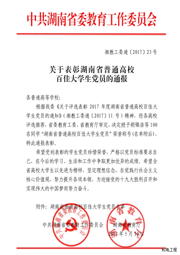 关于表彰湖南省普通高校——百佳大学生党员的通报