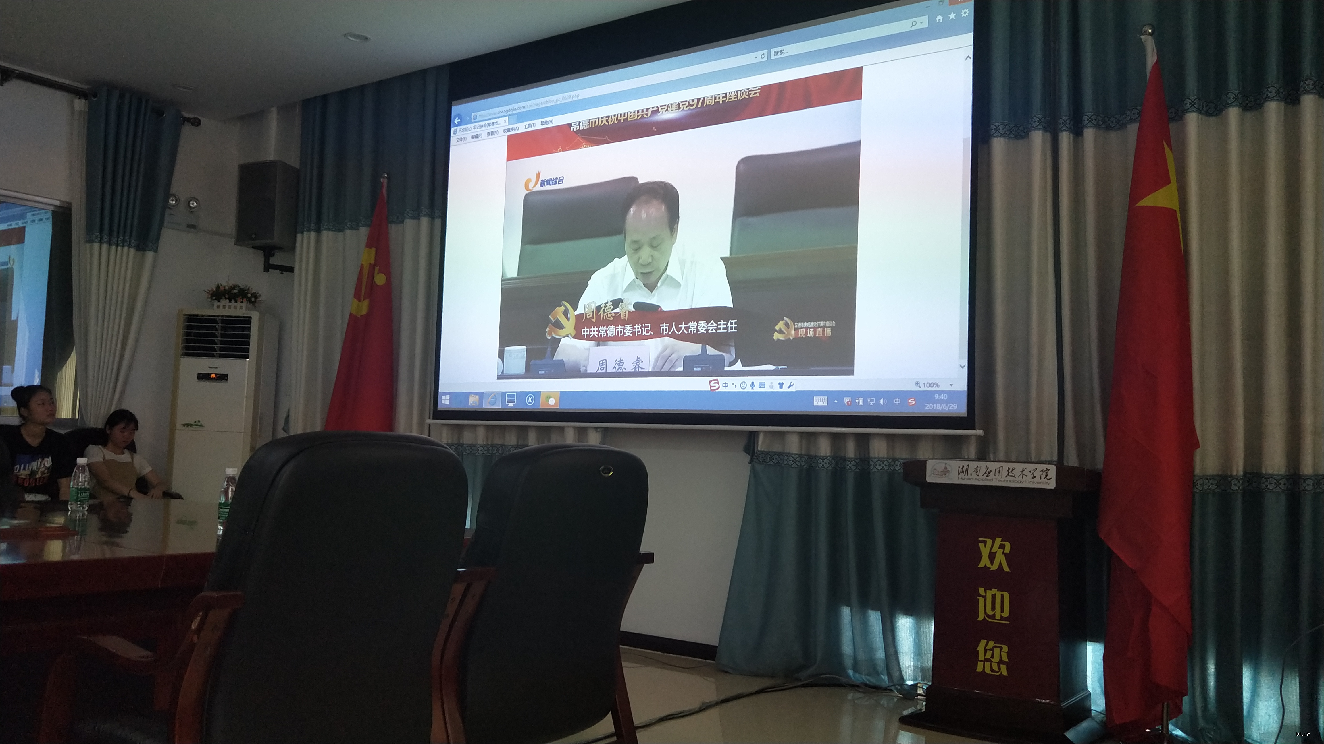 2018年6月,我校部分领导及党员代表在西校区图书馆6楼观看不忘初心牢记使命常德市庆祝中国共产党建党97周年座谈会。座谈会在常德市镇德桥镇党校对全市33万党员进行直播,这是常德市第一次在智慧党建平台进行直播。